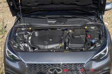 Si on le brusque, il devient vite inconfortable. La raison : pour compenser sa surélévation par rapport au Q30, les ingénieurs l’on réglé plus ferme. C’est génial car il est de ce fait à la hauteur de son allure dynamique mais il est ferme, trop ferme parfois, sur mauvais revêtement les suspensions peuvent taper. Dès lors évitez le mode sport qui n’a d’intérêt que pour le durcissement du volant en effet bien mollasson en mode « eco » ou normal. De plus, à quoi bon faire hurler cette mécanique diesel, car même si elle accepte avec énergie les envolées jusqu’à 4500 t/min et que le son propagé n’est pas si affreux, cela demeure un diesel. Il peut tout de même pousser les 1’610 kg de 0 à 100 km/h en 8,7 secondes.