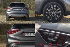 Le QX30, c’est un très long capot terminé par une calandre grillagée à deux arches « Infiniti » entourée de feux minces au regard étiré vers l’arrière, un toit bas (1,52m soit à peine deux centimètres plus haut que la Q30) prolongé par un aileron, des vitres arrière latérales plongeantes avec un retour stylistique en forme de « Z », un gabarit raisonnable (4,42m de long) et un porte-à-faux arrière court.