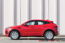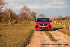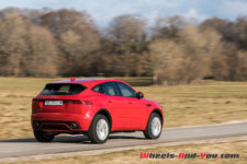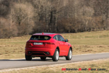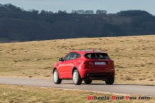 Avec ses 4.395 mètres de longueur, sa largeur de 1.984 mètres sans rétroviseur et une hauteur de 1.649 mètres, le E-Pace est plus large et pratiquement aussi haut que son grand frère le F-Pace ! Il est même 6 cm plus haut que le Land Rover Evoque dont il partage la plateforme. C’est d’ailleurs cette hauteur qui frappe de prime abord, amplifiée par l’espace entre le haut des pneus et les passages de roues. Sur le plan esthétique, j’aurais personnellement préféré une élévation de caisse un peu moins importante, d’autant que la garde au sol aurait encore été largement suffisante. Les roues de 19 pouces chaussées de pneus 235/55 R 19 peuvent être, en option, upgradées en 21 pouces.