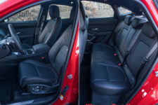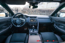 L’intérieur reprend le style des modèles Jaguar récents, toujours d’excellente facture, avec des plastiques moussés sur le tableau de bord et les contre-portes. La version “First Edition” propose un magnifique intérieur cuir avec surpiqûres contrastées. L’ergonomie générale est aboutie et plaisante, excepté peut-être une assise un peu trop haute à mon goût. Les sièges sont beaux et confortables avec toutefois un maintien latéral limité, mais qui conviendra au plus grand nombre.