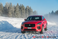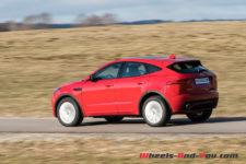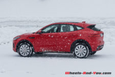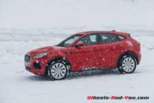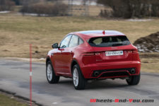 Dès les premiers mètres, je découvre avec plaisir un volant très direct : 2.3 tours de butée à butée ! C’est rare dans la production automobile actuelle et encore plus sur un SUV, malgré l’agrément évident que cela procure en minimisant les mouvements du volant. Les premiers virages démontrent immédiatement les excellentes qualités dynamiques et sportives du châssis. Le E-Pace vire à plat et enroule les courbes sans sourciller, même à vitesse soutenue. De toute évidence, l’amortissement est encore plus abouti que celui du F-Pace, et cela même dans le mode confort. En forçant le rythme, la voiture devient joueuse, l’arrière enroulant volontiers au lever de pied, tout en demeurant extrêmement sûre. Même un gros freinage en appui ne la déstabilise pas. J’ai l’occasion de rouler le E-Pace sur la neige et je constate que son équilibre demeure neutre et sécurisant. Une vraie réussite, qui plus est pour un SUV !