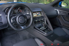 La profonde boite à gants à ouverture électrique, l’éclairage conducteur ou passager que l’on déclenche en passant sa main devant, c’est remarquable et luxueux. L’écran tactile parfaitement intégré est très large et offre tout ce dont une voiture de 2018 a besoin en termes d’assistance et de connectivité. Les ouïes centrales de la climatisation ne se font voir que si on utilise la climatisation niveau haut (tableau de bord) : superbe. La sono puissante avec basse et tweeter de marque Meridian restitue un bon son. L’option volant avec méplat et grosses branches rajoute de la sportivité à cette F-Type. Le rétroviseur est fin, sans rebords, très design. Jaguar nous propose ici un intérieur luxueux d’une GT du 21ème siècle.