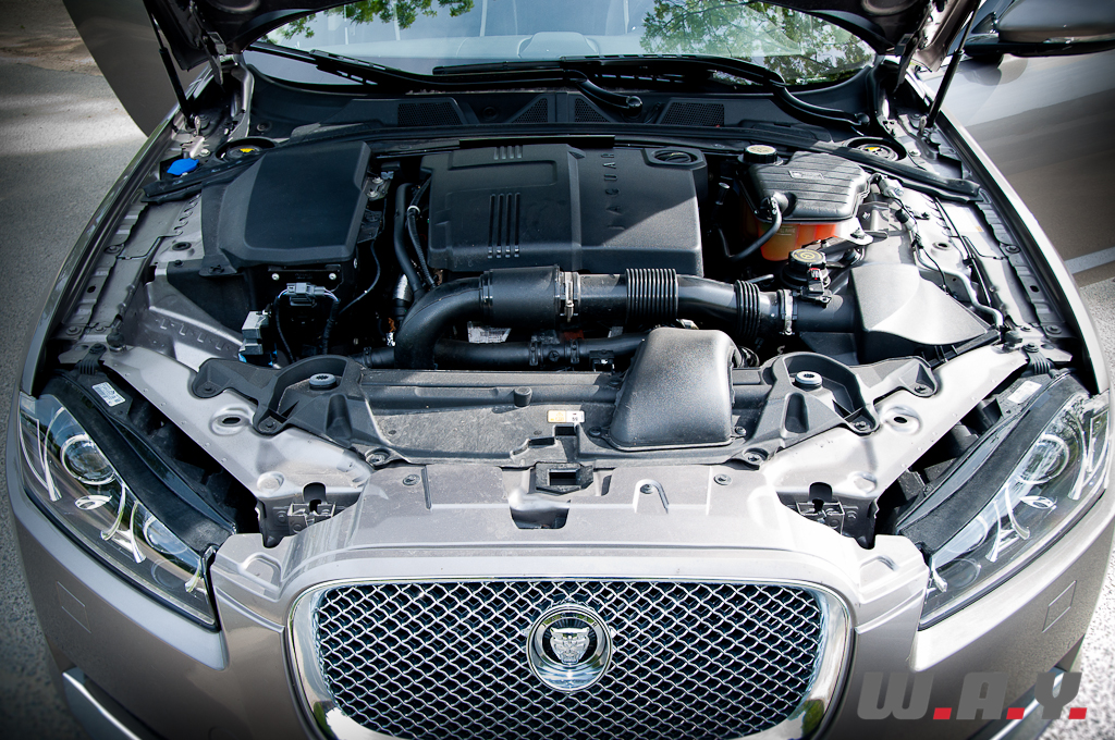 Pour bien juger ce nouveau « petit » moteur, il faut d’abord le mettre en face de l’ancienne version 6 cylindres 2.7 l. biturbo, dont la conception remonte à plus de dix ans. Surprise : le quatre-cylindres fait mieux presque partout, avec un couple de 450 Nm contre 435, un poids évidemment inférieur et en prime une consommation qui chute drastiquement. Durant l’essai et avec le système Start/Stop activé, j’ai constaté une moyenne de 7 litres, ce qui veut dire que le conducteur modéré atteindra facilement 6.5 litres, profitant d’une autonomie de près de 900 km. Selon le communiqué de presse, jamais une Jaguar n’avait offert un tel champ d’action. Je confirme, à une exception près : l’inoubliable XJ6 « double réservoir » de l’époque, mais uniquement parce qu’elle embarquait au moins autant d’essence qu’un Airbus prêt à décoller pour Auckland. Mais parlons performances : au kilomètre départ arrêté, la différence entre l’ancien et le nouveau moteur est de quelques dixièmes. Mais si les performances n’ont pas souffert – merci aux pistons à faible frottement et autres optimisations – la sonorité du moteur, on s’y attendait, est loin d’être flatteuse. Surtout au ralenti et lors de “kick-down” intempestifs où il manque nettement de rondeur. Par contre, en conduite normale (comprenez dynamique, car la XF ne se conduit pas autrement), le son et les vibrations ne sont pas comparables aux autres moteurs du marché. En charge, Il distille une sonorité plaisante, presque comparable à certains 6 cylindres. Ce n’est pas un V8 « Supercharged », mais ça colle plutôt bien à l’esprit cossu Jaguar. Et à vitesse élevée, le chuchotement est toujours de rigueur alors que, du moteur, vous ne voyez que l’effet : le paysage qui défile. Nul doute que les ingénieurs ont fourni un travail de fourmi pour arriver à un tel résultat, notamment à l’aide de supports moteurs actifs et de profondes modifications du bloc moteur. Ainsi, si la marque a cédé au downsizing, elle n’a heureusement pas bâclé la mise au point.