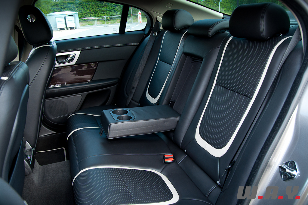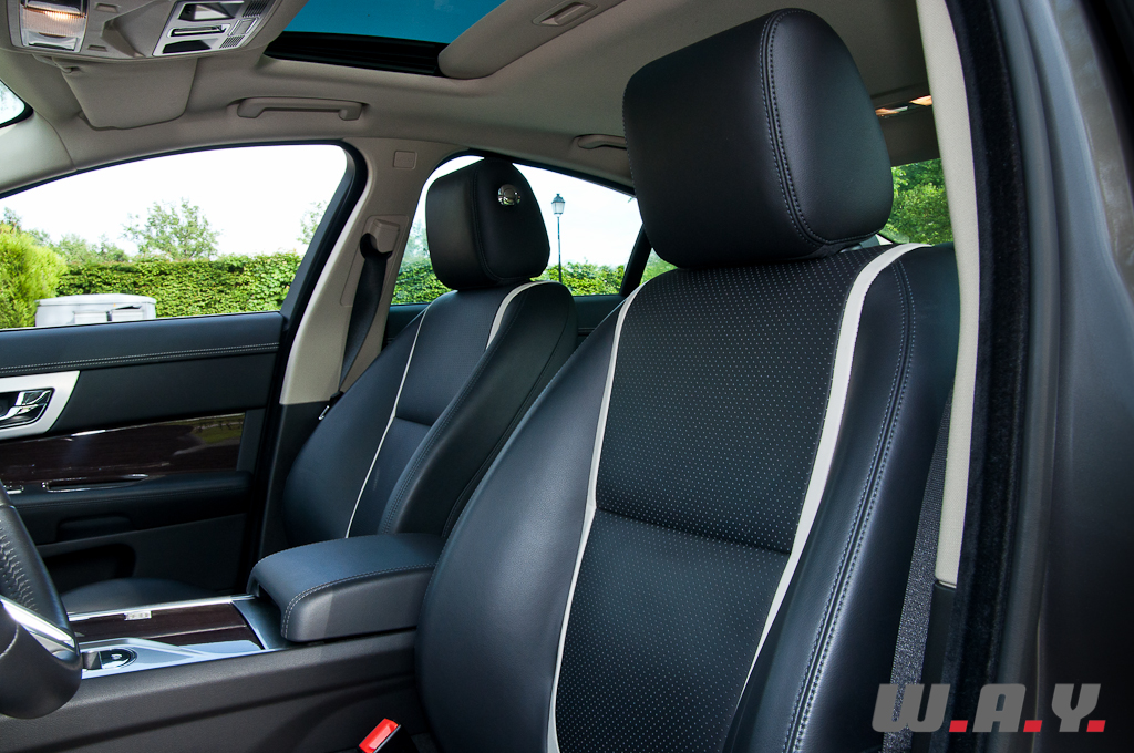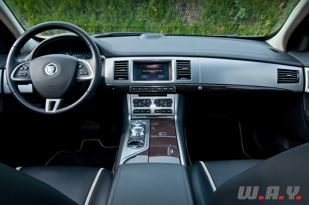 Entrer dans une Jaguar, pour l’automobiliste moyen, est une expérience en soi. Ce qui m’a surpris, pour ne pas dire « bluffé », en tant que néophyte, c’est la sobriété, voire la simplicité des formes, des matériaux et des fonctions. Pas de dessins futuristes, de boutons multi-usages, de connecteurs disséminés ça et là. Oubliée la ronce de noyer, c’est du bois foncé qui habille la console centrale et les contre-portes, le tout est du plus bel effet et à l’avantage d’être indémodable. L’atout de cette voiture, c’est qu’il n’y a pas de temps d’adaptation : tout tombe sous le sens et sous la main. Prenons le « Cruise control », qui s’enclenche d’une simple pression sur le volant, sans passer par l’inutile sélecteur ‘On/Off’, l’absence de bips sonores, où encore le sélecteur de la boîte automatique 8 vitesses dont la forme – qui rappelle un « Puck » de hockey sur glace – et la taille sont tout simplement parfaits. Mais tout n’est pas parfait : le grand écran tactile regroupe intelligemment toutes les fonctions, mais sa réactivité laisse un peu à désirer. Si le GPS est efficace, il demande un temps d’adaptation pour un utilisateur de « Garmin » ou de « TomTom ». Et enfin, le lecteur DVD a connu sur notre voiture quelques ratés de démarrage. La XF est large (192 cm, contre 186 pour une BMW série 5), ce qui se ressent de l’intérieur, où les passagers bénéficient d’un généreux espace aux coudes. L’ambiance est baignée de sérénité, la position de conduite idéale, mais lorsque le siège est réglé au maximum de la hauteur, la garde au toit est un peu chiche, surtout avec l’option « toit ouvrant ». Ceci ne concerne toutefois que les gabarits de plus de 190 cm. A l’arrière, l’espace pour les jambes est suffisant mais pas extraordinaire, contrairement au coffre à la profondeur abyssale qui profite le plus de la longueur totale et qui est capable d’engloutir une poussette ainsi que 2 petites valises. Alors que d’autres voitures vous gratifient d’une petite musique lorsque vous arrivez a destination voire d’une animation a l’écran, amusante pour les uns, énervante pour les autres, la XF vous offre le contact du bois verni à chaque fois que vous actionnez les vitres, et celui de l’aluminium massif lors des changements de mode de la boîte automatique. La technologie est bien là, mais invisible et silencieuse. Qui a envie de configurer sa voiture, alors que tenir à jour ses cartes GPS, changer la sonnerie de son Smartphone ou programmer son micro-ondes constituent un casse-tête quotidien ? Bien au contraire, ce que vous offre l’Anglaise, c’est un petit « spectacle » à chaque fois que vous démarrez le moteur : les quatre buses d’aération pivotent sans bruit, de concert avec le volant électrique qui s’ajuste et le sélecteur de vitesses qui sort majestueusement de son logement. Un procédé… complexe, coûteux et parfaitement inutile. En somme, exactement comme l’art où les rêves. Et pourtant, qui peut imaginer un monde sans l’un ou l’autre de ces refuges ? Pour ma part, je cautionne tout ce qui parle à l’enfant qui sommeille en chaque amateur d’automobile. Aujourd’hui encore, plusieurs jours après avoir repris mon propre véhicule, il m’arrive d’attendre que quelque chose se passe au démarrage, au niveau des aérations. Mais non, rien ne se tourne vers moi, si ce n’est ma femme, impatiente, me demandant ce que j’attends pour mettre la marche arrière. Longue vie donc au charme Anglais et à l’anticonformisme automobile.