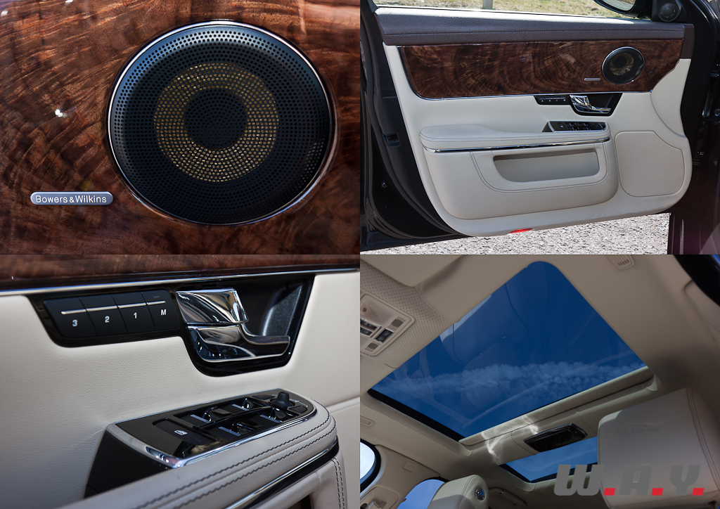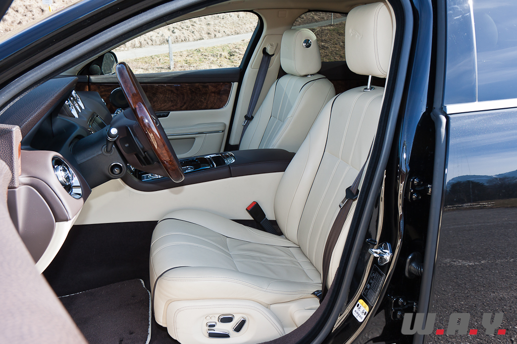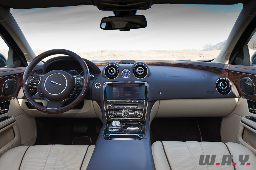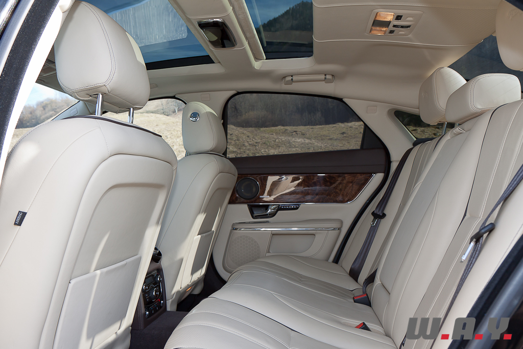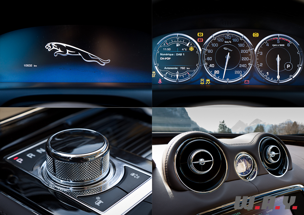 Impossible, également, de rester indifférent à l’intérieur. Table rase du passé en termes de design, certes, mais conservation des ingrédients essentiels à un intérieur Jaguar : placages de bois précieux, cuirs tendus et chromes brillants. Le tout s’accorde à merveille dans une atmosphère plutôt sportive. Un énorme tunnel central sépare les occupants à l’avant. L’espace dévolu aux passagers arrière est cependant relativement compté compte tenu du gabarit de l’auto. Toutefois, pour les « Grandes Remises », une version châssis long est disponible, offrant une douzaine de centimètres supplémentaires entièrement dévolus à l’espace au jambes des grands gabarits prenant place à l’arrière.
