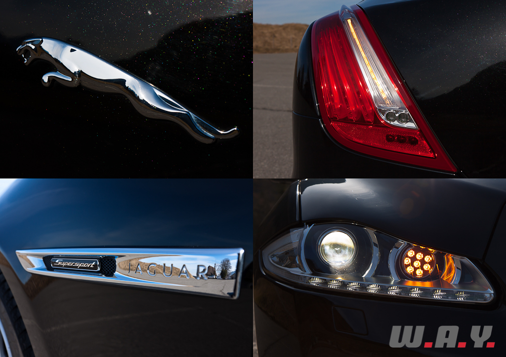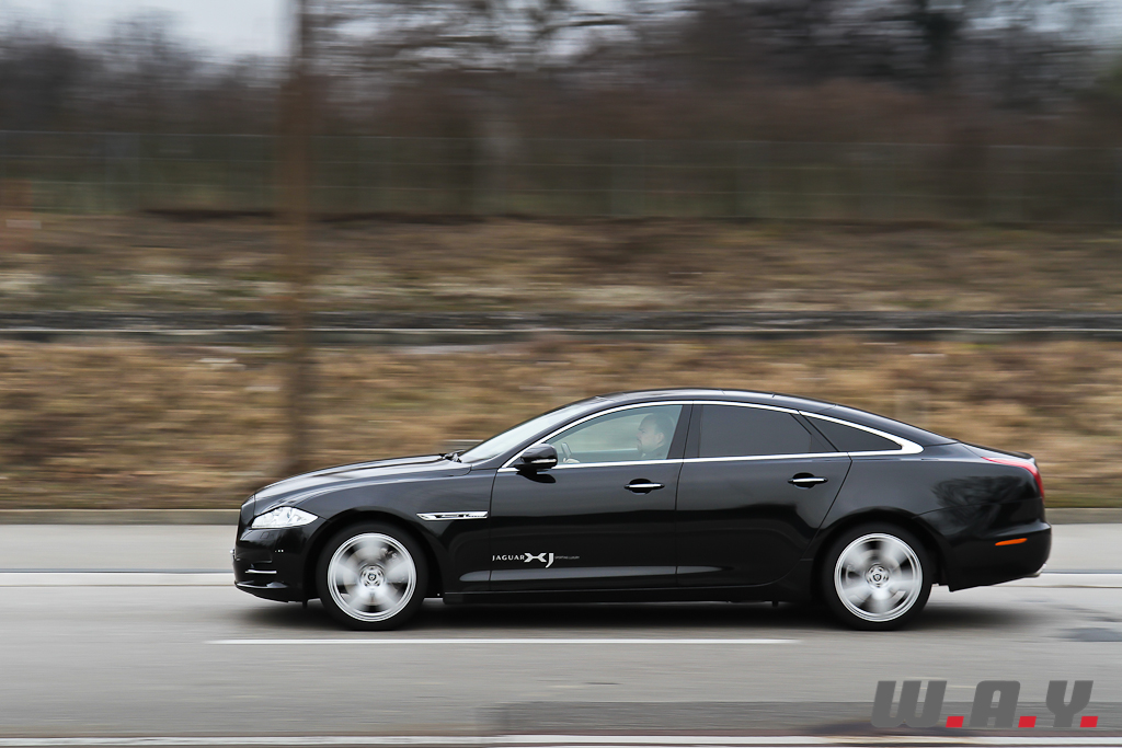 La mission qui incombait à Ian Callum, patron du design, était de totalement réinventer la XJ. Il s’agit pour le moins d’un pari audacieux ! S’attaquer à l’icône d’une marque est loin d’être une sinécure, risquant de heurter les clients les plus conservateurs, voire les sacrifier pour en conquérir d’autres. En toute franchise, les premières photos apparues il y a près de deux ans ne m’avaient guère convaincu. Pas assez de grâce, ligne « deux volumes et demi » trop moderne, peu de liens avec la mythique ancêtre, je ne lui prêtais qu’un intérêt distant. Puis vint la présentation dans une concession du coin. Je revois mon jugement : en métal la XJ est autrement plus séduisante qu’en photos ; d’ailleurs, au moment des prises de vues pour cet article, la belle ne s’est pas laissé facilement capturer. Les lignes sont tendues, athlétiques, recelant sous certains angles de faux airs de Maserati Quattroporte ou Aston Martin Rapide. La face avant, magnifique, semble prête à vous bondir dessus avec ses yeux perçants et l’énorme calandre, tandis que l’arrière, massif, ne s’orne que du Jaguar élancé pour seul moyen d’identification. L’originalité de sa ligne ne trouve guère de concurrentes directes dans la production d’Outre-Rhin, si ce n’est l’Audi A7 ou la Mercedes-Benz CLS, voire, dans une moindre mesure, la Porsche Panamera.