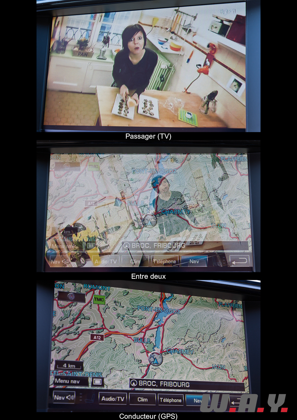 Devant le conducteur, une multitude d’écrans. En premier lieu, sous la casquette abritant l’instrumentation, un large LCD reproduit virtuellement la présence du tachymètre, du compte-tours et des diverses jauges (essence, température d’eau). Selon le mode d’utilisation de l’ordinateur de bord ou du GPS, l’affichage des jauges disparaît pour laisser apparaître les instructions du GPS et/ou sa carte. Déroutant au premier abord, laissant craindre l’appartition de reflets suivant les conditions de luminosité, cette technologie s’avère plutôt ludique et agréable à l’utilisation. Il ne restera plus qu’à juger de sa qualité et fiabilité au fil des années. Le design des cadrans s’inspire des compteurs « Smiths » des Jaguar d’antan. La console centrale abrite également un grand écran, tactile, centralisant les fonctions de GPS, de l’ordinateur de bord et le système audio/vidéo/TV TNT. La diffusion à l’écran permet de dédoubler l’image sur toute sa surface: à savoir, depuis le côté conducteur, afficher les données du GPS ou l’ordinateur de bord, pendant que le passager avant se relaxe devant le dernier épisode de sa série préférée. Seul le son, diffusé au travers des vingt hauts-parleurs Bowers & Wilkins totalisant 1’200 watts pourrait éventuellement distraire le conducteur. Qu’à cela ne tienne, un casque sans fil est à disposition des passagers !