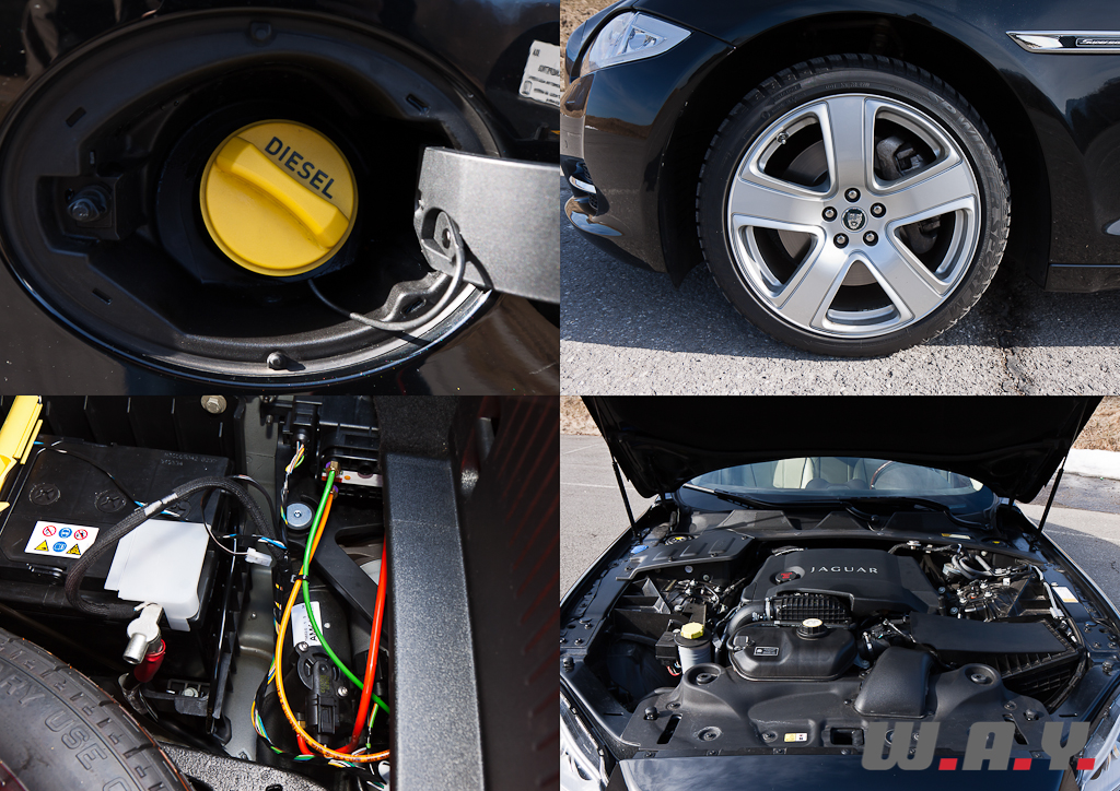 Equiper une limousine de cet acabi d’un « simple » V6 diesel peut paraître, de prime abord, un peu chiche. Détrompez-vous ! D’une cylindrée de 2’993 cm3 et développant 275 CV à 4’000 t/min, l’intérêt de ce propulseur biturbo réside dans sa valeur de couple : 600 Nm à 2’000 t/min, « seulement » 25 Nm de moins que la version la plus puissante de la gamme (5.0 l. V8 Compresseur, 510 CV). La différence sur ce point est donc insignifiante et le petit V6 garantit à la grande XJ des reprises canon. Par contre, lorsqu’il s’agit d’aborder la question de la consommation, le diesel l’emporte haut la main ! Sur notre essai d’environ 2’500 km, mené pourtant à bon train et sur bon nombre de types de trajets différents, la consommation moyenne mesurée à la pompe ne l’élève qu’à 8.8 litres/100 km (contre un 7.0 l/100 km optimiste annoncé par Coventry). Mais la performance reste de taille pour un monstre de plus de deux tonnes en ordre de marche tous pleins faits avec le chauffeur, 2’015 kg exactement (poids à vide constructeur : 1’796 kg). De quoi rendre votre pompiste inquiet ! Je me plais également à souligner l’absence de toute vibration, un silence de fonctionnement exemplaire, et un ronron agréable en forte sollicitation. Trois qualités rares parmi les motorisations diesel.