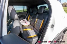 Ne vous attendez pas à une révolution en termes de design ; l’Avenger 4xe ne diffère que peu de la déclinaison Electric. Le bouclier avant voit ses ouvertures agrandies et la disparition de la lèvre inférieure argentée lui confère un aspect un peu plus agressif. Celui de la finition The North Face Edition de cet essai intègre deux piliers verticaux contrastés ainsi qu’un capot avec surface centrale noir mat et jaune. La traditionnelle calandre conserve les 7 haricots emblématiques de la marque mais demeure fermée malgré la présence du moteur thermique sous le capot. Ces éléments intègrent un dessin rappelant les courbes de niveaux d’une carte topographique.