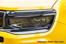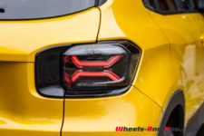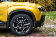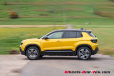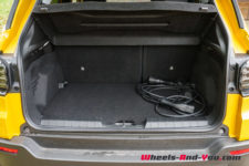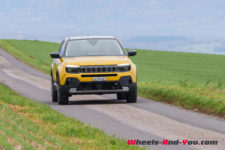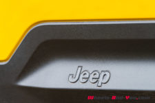 On retrouve les sept haricots typiques de la marque sur une face avant très verticale. Le profil est un peu moins « boîte à chaussures » que celui du Renegade, la ligne de toit paraissant également plus basse ; la peinture bi-tons de mon véhicule d’essai n’y est peut-être pas étrangère. Les bas de caisse sont bien protégés par des éléments plastiques, comme les gros passages de roues qui conservent style trapézoïdal propre à Jeep. La teinte Jaune Soleil (Sun Yellow) et les jantes de 18’’ chaussées de pneus de 225 mm de large participent à un look moderne et dynamique qui devrait plaire autant à la gent féminine que masculine.