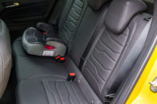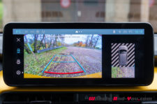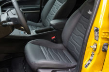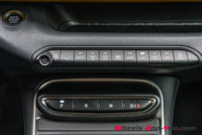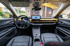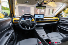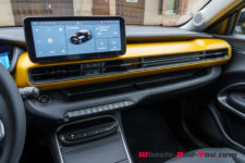 Les sièges – en cuir sur mon véhicule de presse – sont confortables, l’ergonomie du conducteur très correcte excepté peut-être la sélection de transmission qui adopte quatre boutons (P, R, N et D) sur la console centrale plutôt qu’un sélecteur unique. Les commandes de climatisation demeurent physiques, avec une série de boutons joliment disposés sur l’arrête d’un grand vide-poches qui traverse toute la planche de bord. Cette dernière est égayée par un rappel de la teinte extérieur. Le tunnel central comporte plusieurs rangements et un chargeur de téléphone par induction, dissimulé sous un volet qui fait penser à une protection d’iPad. Certes, les plastiques sont assez basiques mais cela contribue sans doute à limiter le poids du véhicule.