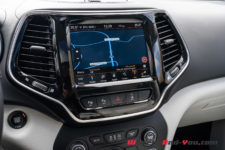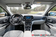 A part une assise que je trouve bien trop haute, l’ergonomie générale est attrayante et sans surprise pour un véhicule américain. La première chose qui me frappe est le bruit du moteur. Le 4 cylindres s’avère plutôt bruyant lorsqu’on le sollicite et d’une sonorité surprenante : on dirait un petit diesel avec un cliquetis sonore peu agréable, vraiment pas en phase avec un SUV plutôt confortable par ailleurs. A ce point près, le moteur est vraiment surprenant de docilité et d’allégresse. Il emmène avec une étonnante facilité les deux tonnes du Cherokee, à tel point qu’on croirait ce dernier peser 500 kg de moins. Les performances sont d’ailleurs quasi équivalentes avec celles de la précédente version V6 atmosphérique et cela malgré un couple de 50 Nm inférieur.