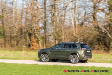 Je trouve par contre l’agrément de la transmission automatique d’un autre temps. Si elle fonctionne plutôt bien et sans à-coup à l’accélération, elle est d’une lenteur affligeante au kick-down ou en mode séquentiel. Comme au freinage elle ne rétrograde que lorsque le régime moteur descend à env. 1’100 t/min, elle doit obligatoirement descendre un voire deux rapports lorsqu’on remet les gaz. Or chaque rétrogradage demandant environ une seconde pleine – oui, vous avez bien lu ! Lorsque je remets les gaz après un gros freinage, rien ne se passe avant un temps qui parait une éternité, au point qu’au début de mon essai, je me suis demandé si le moteur avait un souci de coupure d’injection. Et en mode séquentiel, c’est la même chose : il faut attendre une seconde après la pression sur l’une des palettes pour que la boîte daigne finalement changer de rapport, autant en accélération qu’au rétrogradage. Si c’est évidement frustrant lorsqu’on souhaite rouler un peu dynamiquement, ce n’est pas vraiment pénalisant lorsqu’on roule tranquillement en mode automatique, dans un style « américain ». Reste que sur les routes européennes, on a parfois envie d’un peu plus de dynamisme, même au volant d’un SUV.