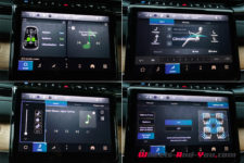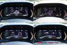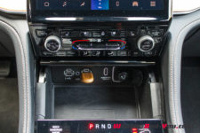 Trois écrans habillent le tableau de bord : un de 10.1 pouces au centre pour l’infodivertissement, rapide et intuitif, un deuxième de 10.25 pouces en guise de compteurs et un troisième de 10 pouces exclusivement réservé au passager. Rangements, connectiques et boutons jonchent cet intérieur accueillant. Il ne manque rien, ni à l’avant, ni à l’arrière. Le conducteur bénéficie également d’un affichage tête haute. Seul et unique reproche, la position du frein à main à proximité directe de la poignée d’ouverture du capot. Question d’habitude mais j’ai par deux fois ouvert ce dernier !