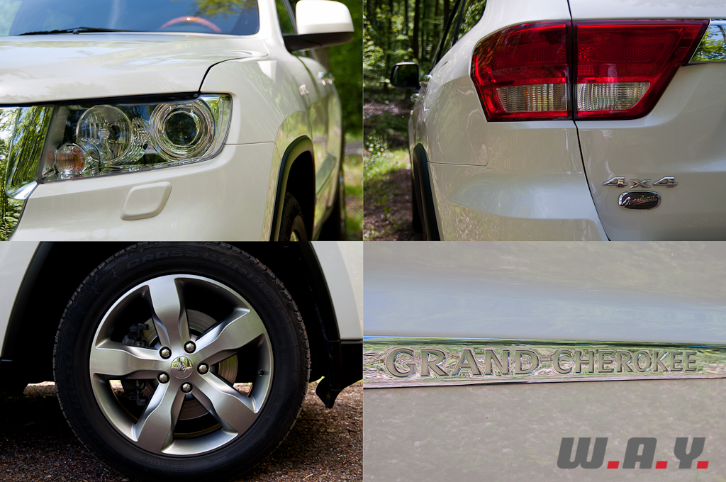 Si en vingt ans le style n’a pas drastiquement changé, il faut reconnaître qu’il a fière allure ce nouveau Grand Cherokee. Très élégant, imposant sans être gros, il dégage une image sûre de lui et affirme sa présence sur la route. Nous retrouvons la calandre chromée avec ses sept ouïes d’entrée d’air comme c’est le cas sur toutes les générations de Grand Cherokee. Les projecteurs plutôt modernes surplombent l’immense pare-chocs intégrant les antibrouillards tandis que les crochets de remorquage accentuent l’image « baroudeur » et le radar de distance du régulateur de vitesse rappellent ses capacités de « routière ». Le capot nervuré affine un peu l’ensemble qui est très anguleux, voire brut. Avec ses passages de roues carrés et une ligne globalement droite et simple, les designers n’ont pas cherché à révolutionner le dessin mais plutôt garder l’identité du Grand Cherokee tout en lui donnant un look plus actuel. Associée à la couleur blanche de notre voiture d’essai, l’utilisation du chrome en quantité, comme l’immense bande située entre les feux arrière et les énormes jantes 20″ lui ajoute un côté bling-bling typiquement US. J’ai d’ailleurs croisé quelques Grand Cherokee dans des teintes foncées, noir ou gris, lui conférant plus d’élégance. Extérieurement, à l’exception des grandes jantes polies et du petit logo Overland sur la malle arrière, rien ne permet de différencier cette finition haut de gamme du reste de l’offre.