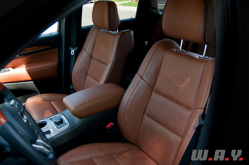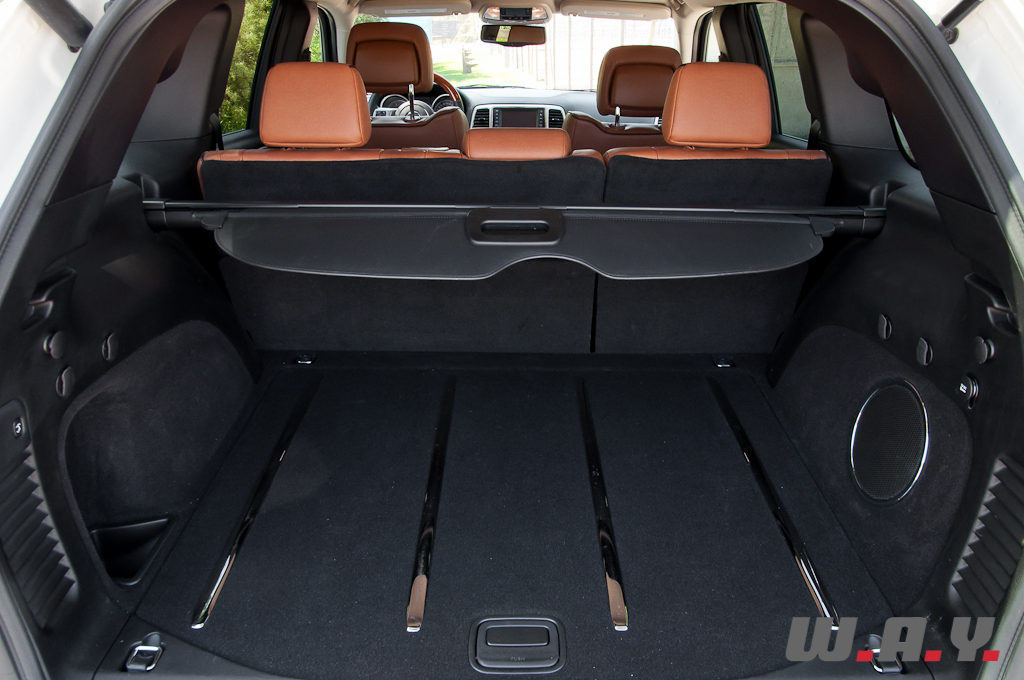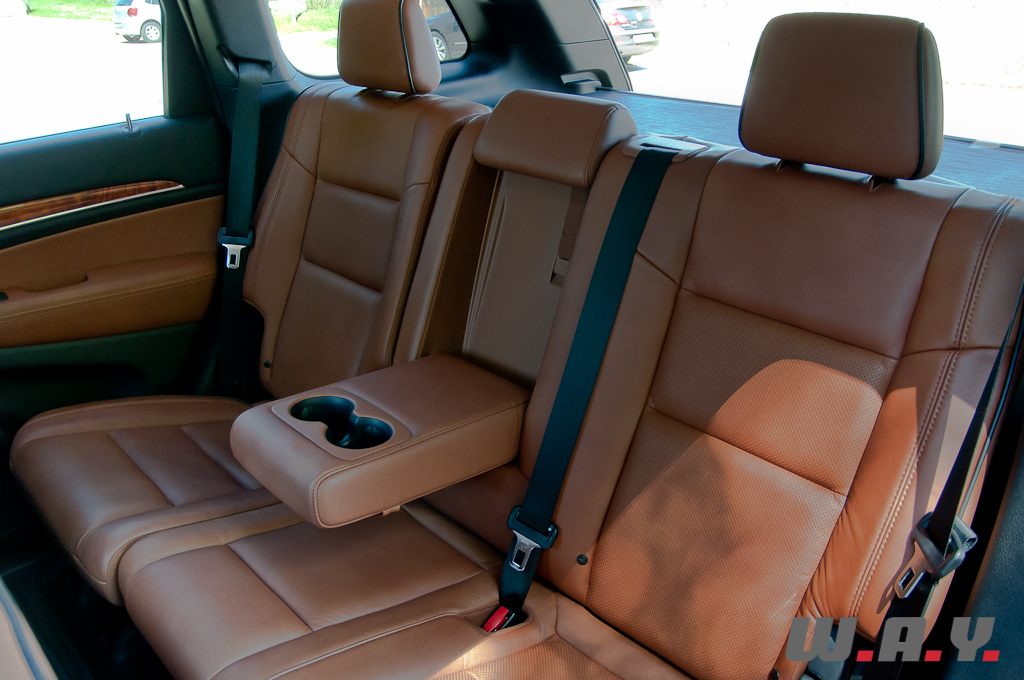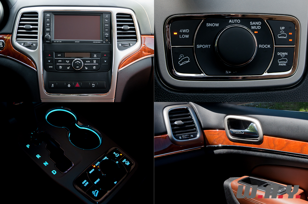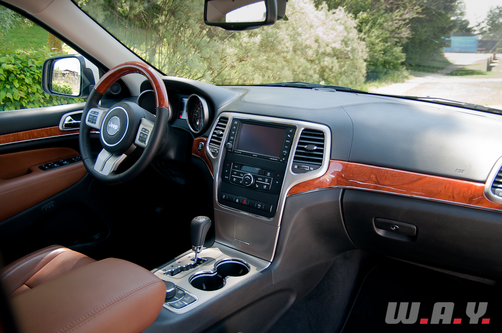 C’est tout l’inverse à l’intérieur. Le luxe à l’américaine s’affiche clairement dans un goût, qui je dois reconnaître, ne m’a pas totalement convaincu. Mais c’est bien évidemment un avis très personnel. Les sièges et les contre-portes sont habillés d’un cuir couleur caramel de très bonne qualité. Le tableau de bord est recouvert de cuir noir avec des surpiqûres caramel, souligné par divers placages en vrai bois, plus un peu d’aluminium et de chrome par-ci par-là. L’ensemble m’a laissé un peu perplexe surtout du fait de la teinte extérieure du véhicule. Peut-être qu’avec un coloris plus foncé, noir par exemple, il aurait eu plus de gueule. Passons sur ces détails subjectifs et attardons-nous sur l’intérieur de notre salon roulant. Eh oui, avec autant de cuir et de bois, on pourrait se croire dans un château. D’ailleurs au vue de la production automobile actuelle, l’ergonomie et l’apparence de l’espace à bord est relativement austère, voire vieillotte malgré la finition luxueuse, un peu comme une bâtisse ancienne. Mais encore une fois, les traditions peuvent avoir du bon et sans bousculer les genres, on se sent à l’aise dans cet intérieur cosy et chaleureux. Le volant à jante très épaisse, presque un peu trop si Madame emprunte votre voiture, est lui aussi recouvert de bois et de cuir. La qualité des matériaux utilisés est aussi en nette amélioration par rapport à la version précédente. Le constructeur a bel et bien fait un effort pour se battre à armes égales avec les concurrents allemands et anglais. La vision extérieure est excellente et l’assise est confortable, les kilomètres s’avaleront sans souci à bord de ce nouveau Grand Cherokee. Vos passagers seront tout aussi à l’aise tant l’habitabilité est exemplaire pour la catégorie et l’immense coffre de 782 litres au hayon à commande électrique pourra accueillir sans peine les bagages de toute la famille. Sa capacité passe à 1’554 litres si vous rabattez la banquette arrière. Confort et luxe sont bel et bien au rendez-vous, sans oublier la technologie, bien évidemment. Mais encore une fois, en comparaison avec la concurrence, le tout semble un peu dépassé même si au niveau de la richesse il répond aux mêmes attentes avec par exemple un radar de distance, une caméra de recul, un module GPS intégré et un détecteur d’angle mort. J’émettrai quand même une réserve tant sur la réception FM que j’ai trouvé particulièrement mauvaise, à croire que les intervalles de fréquence US étaient encore programmées sur cette voiture, que sur l’interface globale GPS/ordinateur de bord/Hifi, qui, ô surprise, est emprunté pour l’occasion à la Ferrari California (!), mais dont l’ergonomie générale demeure archaïque et fort peu intuitive.