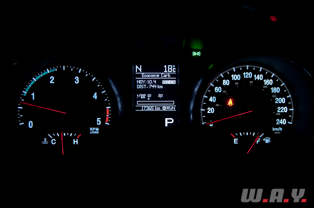 Point de gros V8 essence pour cet essai, mais un V6 3.0 turbo diesel d’origine italienne qui développe la puissance intéressante de 241 CV pour un couple de 550 Nm. Dans la version de base appelée Laredo, le même moteur propose une puissance de 190 CV et c’est uniquement sur les finitions Limited ou Overland, celle de notre essai, qu’il atteint 241 CV. Certes j’aurais préféré le modèle SRT8 avec son V8 6.4 de 468 CV, mais il faut bien reconnaître que dans l’environnement actuel, le diesel est nettement plus approprié à un tel véhicule. Un peu bruyant au démarrage, ce moteur sait se montrer relativement discret une fois lancé. Très coupleux, il répond à la moindre sollicitation de la pédale d’accélérateur, quelle que soit la configuration de la route. En ville, il est suffisamment souple pour évoluer en toute quiétude malgré la masse imposante de la voiture. La boîte automatique cinq rapports est un peu dépassée mais on nous annonce l’arrivée prochainement d’une nouvelle boîte à huit rapports. Malgré sa sonorité « agricole », ce nouveau Grand Cherokee est un bon cheval, disponible et efficace en toutes circonstances. Niveau consommation, si le constructeur nous promet une moyenne de 8.3 l./100km en utilisation mixte, j’aurai mesuré tout au long de mon essai une moyenne de 10.4 l./100 km. Certes en habitant en moyenne altitude, 860 mètres pour être précis, je sollicitais franchement les ressources de ce Grand Cherokee à chaque fois que je remontais chez moi. J’ai pu par ailleurs noter que l’ordinateur de bord était plutôt précis puisque ce dernier affichait seulement 0.2 litre de moins que ce que j’avais mesuré à la pompe. En tenant compte de cette petite marge d’erreur, j’ai pû noter une consommation sur autoroute de seulement 7.5 l./100 km soit quasiment les valeurs annoncées (7.2 l./100 km en extra-urbain) et avec un peu de ville et de campagne, la moyenne dépassait tout juste les 9.0 l./100 km, un chiffre finalement plutôt proche de la consommation mixte donnée.