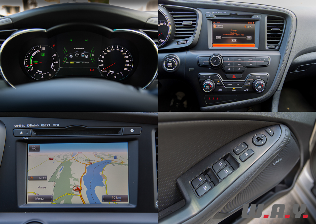 Au niveau de la qualité des plastiques et des finitions, Kia ne joue pas encore dans la même ligue que ses concurrents allemands, mais l’ensemble laisse une bonne impression. Le seul degré de finition disponible de cette Optima est très richement doté en équipements. Le système de navigation possède un écran tactile de 7 pouces et la musique est diffusée par un très bon système audio Infinity. Parmi la profusion d’équipements, j’ai trouvé particulièrement agréable que mon siège soit non seulement chauffant, mais également ventilé. La Kia Optima Hybrid est équipée du système d’ouverture et de démarrage sans clé « Smart Key ».