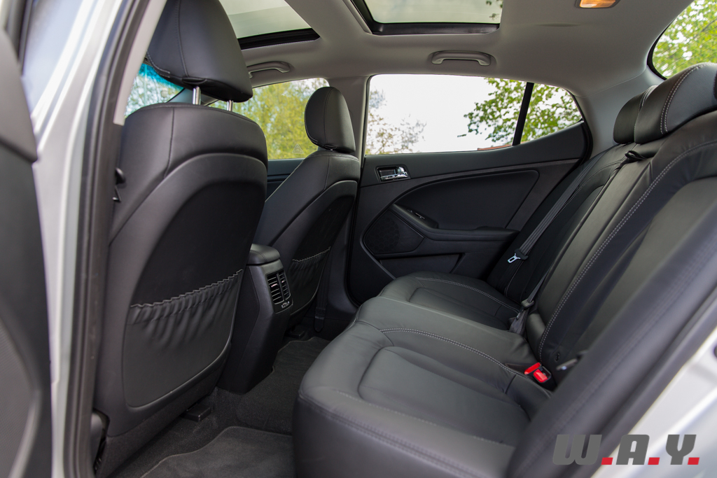 L’habitacle de la Kia Optima Hybrid est spacieux et confortable, sauf peut-être au niveau de la hauteur de toit. Mais il faut reconnaître que mes 198 centimètres font de moi un critique peu objectif en la matière. Le toit ouvrant vitré panoramique – une des rares options – est très agréable mais rabaisse encore de quelques précieux millimètres la hauteur du toit. Les sièges en cuir sont de bonne facture et surtout très confortables. Cela aussi bien à l’avant qu’à l’arrière, où, particularité de plus en plus rare, trois adultes de taille moyenne peuvent aisément prendre place.