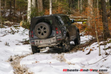 Il est temps de sortir du bitume pour tenter de voir ce que valent les capacités tout-terrain de ce nouveau Defender. Une pression sur un bouton et le véhicule gagne environ 8 cm de garde au sol. Le sélecteur Terrain Response propose divers modes allant des surfaces glissantes neige/glace au franchissement de rochers. Je teste le premier dans un sous-bois enneigé et les 25 cm de veille neige ne m’arrêtent pas. Il faudra une congère d’environ 40 cm pour me stopper malgré le verrouillage des différentiels.