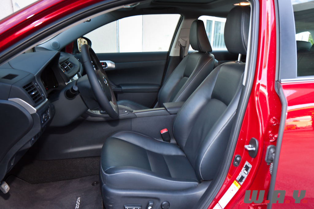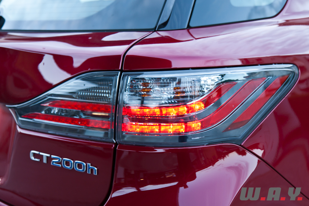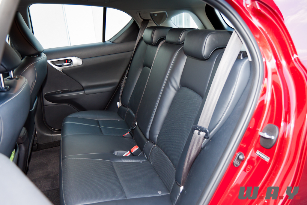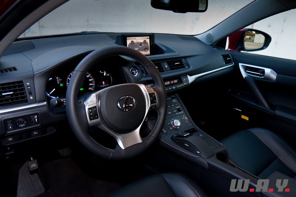 La ligne générale de la Lexus CT 200h reste banale, sans fantaisie. Hormis la face avant très réussie et agressive avec ses ouïes d’aération et les feux soulignés de LED, le reste n’inspire pas la gaieté. Certes, les traits caractéristiques de la gamme Lexus sont repris ici ou là, mais en laissant beaucoup de place à l’insipidité qui règne en maître dans le segment. Les flancs sont plats, aucun relief ou aucune ligne inspirant une once de dynamisme, si ce n’est les bas de caisse. L’arrière, haut perché présente un décrochement trop prononcé au niveau de la ligne de caisse qui rompt certes la ligne mais n’apporte rien de plus au style. Ceci dit, et vu la vocation économique et écologique de l’engin, sa ligne particulière lui permet d’afficher un SCX plus flatteur que celui de son inspiratrice et donneuse d’organes, la Prius. Destinée à assurer le rôle de passerelle pour les clients entre Toyota et Lexus tout en rajeunissant la clientèle de la marque dont la moyenne d’âge dépasse les 50 ans, la CT 200h se fond littéralement dans le paysage dès lors que vous choisissez une couleur passe-partout.