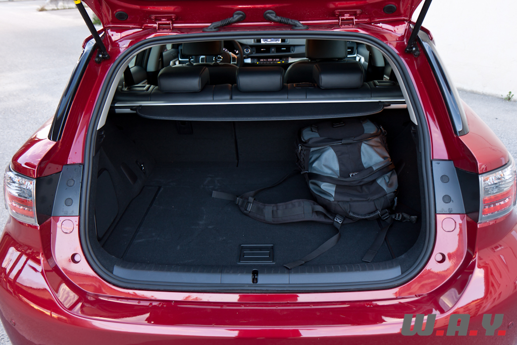 L’espace conféré aux passagers se veut plutôt correct, spacieux à l’avant avec des sièges au maintien excellent. Il n’y a que l’assise que j’ai trouvée un poil courte pour mes longues jambes. A l’arrière l’espace sera un peu plus compté, forcément, tant au niveau des pieds que de la garde au toit. De plus, le manque de relief de la banquette, qui plus est lorsqu’elle est revêtue de cuir comme sur notre modèle d’essai, n’assure que peu de maintien sur l’assise. Le coffre propose un volume de chargement de 375 litres, dans les eaux d’une Audi A3, mais en comptant le bac présent sous le plancher. La présence des batteries du système hybride, à cheval sous la banquette et dans le coffre empiète passablement sur l’espace disponible. Il est toutefois possible de rabattre les dossiers arrière (1/3-2/3), libérant ainsi un volume de 985 litres. Enfin, la dotation de notre modèle « Excellence » est particulièrement riche de série. La liste des options est plutôt réduite, se résumant à la peinture métallisée, le tempomat associé au radar anti-collision, des amortisseurs revus et le toit ouvrant.