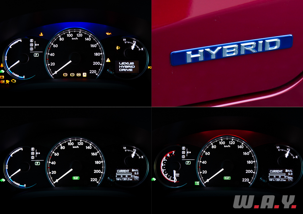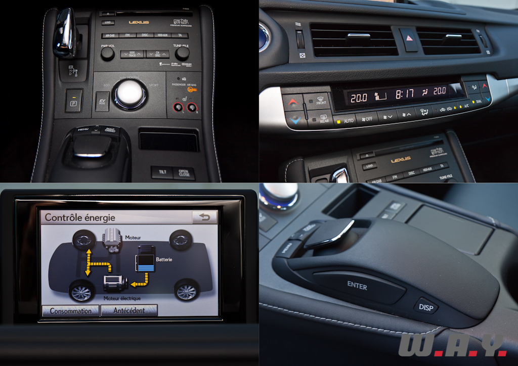 L’habitacle quant à lui est nettement plus réussi. L’esthétique est certes sans fioritures, mais l’ensemble respire la qualité et la bonne facture, comme en témoignent les quelques plages de cuir surpiqué sur la casquette de l’instrumentation ou le tunnel central. La console se veut sobre, accueillant l’ensemble des commandes, tant celles de la Hifi que celles nécessaires au mode hybride ainsi que le mini levier de sélection de marche. Excellent point, la souris placée au bas de la console qui permet de naviguer au sein du module GPS/ordinateur de bord. Si le logiciel du système n’est pas particulièrement intuitif, l’utilisation via ce pointeur s’avère ludique et surtout très efficace, palliant un temps soit peu ce manque d’ergonomie à l’écran. Je regrette cependant, comme « de tradition » chez les constructeurs japonais, ces affichages à cristaux liquides d’un autre âge pour l’horloge et la climatisation. La lisibilité de l’instrumentation face au conducteur est un exemple du genre où seules les informations vitales s’affichent, loin des « sapins de Noël » que l’on a l’habitude de voir sur les autres véhicules à propulsion hybride. L’affichage demeure toutefois modulable, selon que vous ayez choisi le mode « normal » ou « EV » (tout électrique) à dominante bleu et affichage de l’indicateur de charge ou alors le mode « sport » à dominante rouge et affichage du compte-tours.