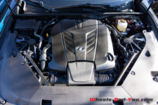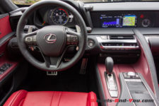 Placé idéalement en position centrale avant, ce V8 est déjà monté sur d’autres modèles de la marque (GS-F et RC-F). Revu et amélioré par Yamaha au niveau de la culasse, ce moteur possède une double distribution variable optimisée VVT-i, un collecteur d’admission à double conduit, des soupapes en titane, des arbres à cames à haute levée et une double injection D-4S. Une technologie pointue pour un moteur rageur faisant preuve d’un appétit en rapport avec ses prestations. En effet, 17.4 l/100km pour une utilisation urbaine et route de montagne avec le pied lourd le ferait presque passer pour un moteur sobre. N’oublions pas qu’il s’agit d’un gros moteur atmosphérique et que la voiture est lourde. Je note que sur autoroute aux vitesses légales, calé sur le dixième et dernier rapport de boite, il descend sa consommation sous les 10 l/100km. Un atmo remarquable d’efficience.