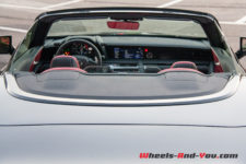 De suite, j’actionne l’ouverture du toit « souple ». Cette capote est composée de quatre couches de tissu et les matériaux utilisés dans l’armature créent une tension optimale minimisant les plis. Ces épaisseurs de tissus contribuent à rendre l’habitacle presque aussi bien insonorisé que celui d’un coupé. La capote repliée, je peux encore plus profiter des vocalises du V8.
