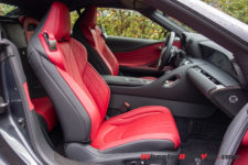 Alors même si, pour certains, on est loin de l’élégance d’une Aston Martin DB11 Volante, le coup de crayon de profil est équilibré et, décapotée comme capotée, elle est aussi belle que racée. Son long capot qui pointe vers le bas sur une calandre trapézoïdale béante « à la Lexus » lui donne une allure d’athlète. L’intérieur de cette calandre, avec ses effets de maille en trompe l’œil, est une œuvre d’art.