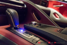 De part et d’autre on trouve les projecteurs à LED à triples lentilles qui sont des plus futuristes. Tout ceci est l’œuvre du designer Tadao Mori, bien épaulé pour la partie dynamique par l’ingénieur Koji Sato. Car n’allez pas croire que « l’emballage » se dessine et qu’après on place la partie dynamique. Non, tout est conçu en harmonie. Par exemple, il n’a fallu pas moins de six mois simplement pour ajuster la géométrie du bras de suspension à la ligne du capot plongeante. Même défi pour y faire pénétrer le V8. L’aérodynamique est affûtée pour bien pénétrer dans l’air sans bruits parasites. Un travail d’équipe pour un résultat qui ne laisse pas indifférent.