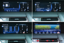 Une fois confortablement installé dans ces sièges bien dessinés, on a sous les yeux un combiné d’instrumentation accueillant la dernière génération de cadrans TFT et ce fameux anneau central mobile hérité de la supercar Lexus LFA. L’ambiance de cette dernière est bien présente à bord. Beaucoup d’originalité dans les commodos et ce touchpad sur la console centrale. Pour moi, il fait trop « geek » et demande beaucoup d’attention pour être manipulé en conduisant.