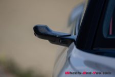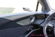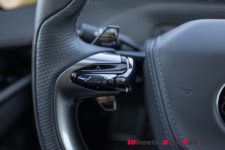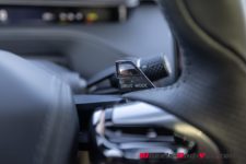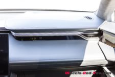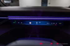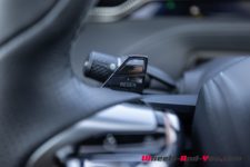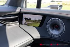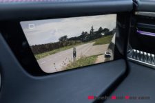 Notre auto de test dispose également d’une rétrovision sans miroir, constituée de deux caméras latérales dans des boitiers en carbone et d’écrans dans les portières. On note également une casquette extractible sur le haut du pare-brise intégrant les LIDARs pour le guidage actif. Elle se déploie avec deux autres senseurs sur les ailes avant lorsqu’on active cette fonctionnalité. Une casquette identique est disposée au-dessus de la vitre arrière, celle-ci étant fixe.