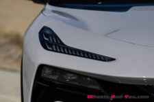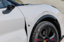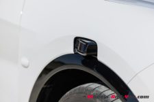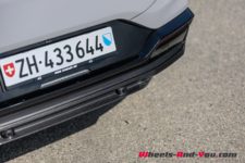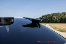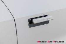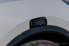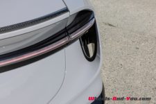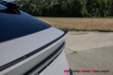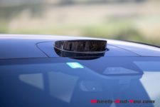 Le toit et les montants latéraux sont peint en noir brillant tout comme les entourages de roues et les bas de caisse. Notre voiture est équipée de roues de 22” mais des jantes de 23” sont proposées en option. A l’avant, les feux de jour et les clignotants sont installés sur le capot alors que les feux de routes sont insérés en-dessous et en retrait ce qui lui donne un nez de requin.