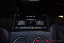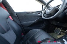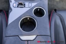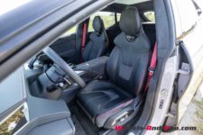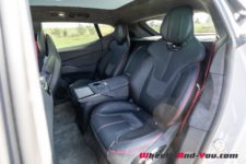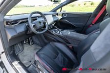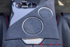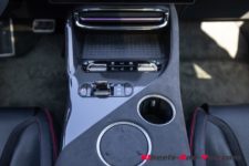 Les sièges sont confortables et bien dessinés. Selon le mode de conduite sélectionné, les coussins latéraux se gonflent pour assurer un meilleur maintien. L’équipement est pléthorique ; tout y est, connexion 5G, chauffage et ventilation des sièges, etc. Le tableau de bord est recouvert de cuir avec des surpiqures de couleur bordeaux, comme les ceintures de sécurité. On trouve des incrustations en carbone à l’avant comme à l’arrière de l’habitacle.