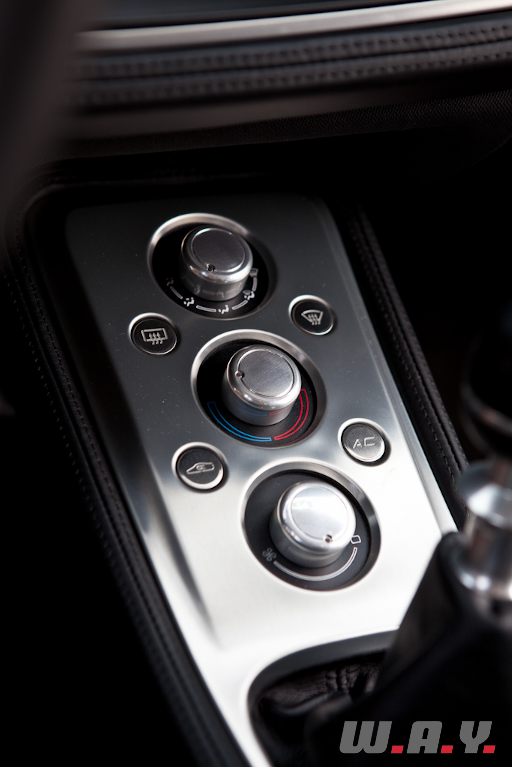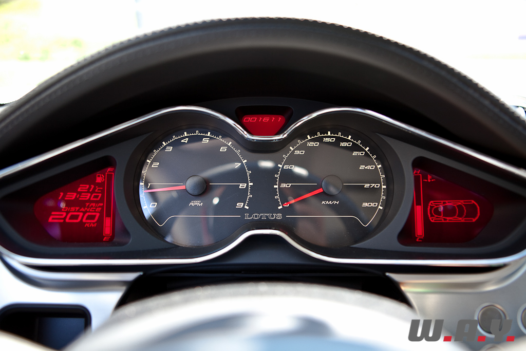 Une fois à bord et calé dans les sièges enveloppants, on ne note pas de changement si l’on compare avec l’Evora standard. Néanmoins, pour ceux qui ont déjà testé une Elise et qui ont raté le premier épisode, il vaut la peine de rappeler un point important : l’intérieur de l’Evora paraît beaucoup plus cossu et nettement moins spartiate que les autres modèles de la gamme. La première impression de votre serviteur a même été de se laisser surprendre par une certaine qualité dans les finitions. En particulier, les parties en aluminium brossé avec le couloir central ainsi que le tableau de bord sont parfaitement intégrés avec des boutons aussi agréables à regarder qu’à toucher.