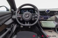 Si le tableau de bord est pratiquement dépourvu de boutons physiques, le volant en possède plusieurs, pour les paramètres de conduite comme le réglage du limiteur de vitesse, le volume de l’installation stéréo ou la prise d’appel téléphonique. Le volant comprend également deux « manettino » pour sélectionner les modes de conduite et le bouton de démarrage de la voiture.