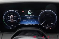 A l’opposé, le mode Max Range limite la vitesse à 130 km/h avec une réponse très douce de la pédale d’accélérateur. Détail cocasse, l’affichage derrière le volant incite régulièrement à monter ou descendre un rapport de boite à vitesse qui est bien entendu inexistante sur cette voiture.