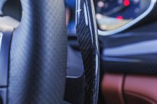 L’ergonomie générale est bonne, avec notamment de belles palettes fixes en carbone de part et d’autre du volant qui permettent de changer manuellement de rapport. Le levier central est celui d’une automatique classique mais se transforme en commande séquentielle. Une série de boutons permet de modifier la configuration de l’auto et les modes de conduite. Ils sont complétés par un sélecteur rotatif en aluminium qui facile la navigation dans les menus.