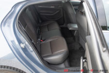 Cet intérieur qui semble dépouillé est en fait très bien étudié et super fonctionnel. Il offre tout ce dont le conducteur a besoin. L’écran central de 8,8 pouces orienté vers le conducteur est bien intégré. L’interface permet désormais la connexion Apple CarPlay et Android Auto. De série, il y a, entre autres, un accoudoir central qui cache un vaste rangement, un système audio avec huit haut-parleurs. Ce système, de marque Bose possède un caisson de basse intégré dans le coffre arrière. Le son réglable avec différentes ambiances permet à tout un chacun d’écouter sa musique avec un « bon » son. Le choix des matériaux et les ajustements sont dignes d’une voiture premium. Le conducteur a sous les yeux trois compteurs cerclés de chrome. Le central est numérique. Il y a cette juxtaposition du traditionnel et du moderne.