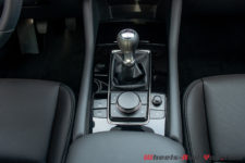 Les ajustements du siège conducteur proposés sont optimums. Le volant se règle en hauteur et profondeur. De quoi être parfaitement installé. Mazda offre de série, pour la première fois dans sa gamme, un airbag genoux pour le conducteur. Sur la console centrale le levier de vitesses a été remonté et avancé. En fait, les ingénieurs ont utilisé un concept pour positionner leurs commandes de manière à ce qu’elles tombent sous la main en liaison avec les mouvements naturels du corps. Très sincèrement pour les personnes de petite taille le levier de vitesse est un peu trop éloigné et oblige à trop s’avancer vers le volant. Pas facile de satisfaire toutes les morphologies.