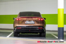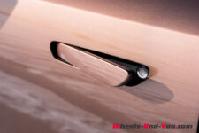 De profil, la voiture paraît longue, avec une ligne supérieure particulièrement douce grâce aux parebrises avant et arrière très inclinés. Les faces avant et arrière ne sont pas verticales mais plutôt « surplombantes ». L’avant du capot surplombe la calandre pleine alors que derrière, l’arrête du coffre est plus en arrière que le bas de son ouverture, m’évoquant un peu certaines pagodes japonaises. C’est inhabituel et cela confère une certaine légèreté à la Mazda 6e, malgré une longueur de 4.921 mètres. Avec une largeur de 1.890 m et une hauteur de 1.485 m, la voiture est plutôt longue et pas particulièrement large.