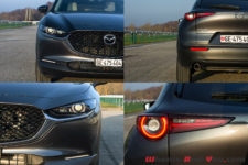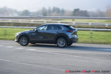 Ce que j’aime le plus sur ce CX-30, c’est son profil avant. Les phares sont en retrait par rapport au capot qui, de ce fait, se prolonge. On dirait la tête d’un squale qui erre à la recherche d’une proie. Avec une longueur de 4,39 m et une faible hauteur de 1,54m (la même que celle d’un CX-3), ce CX-30 est très élancé et démontre par sa forme tout son dynamisme.