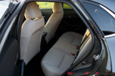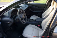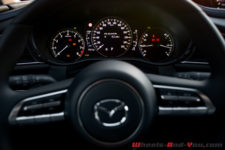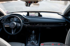 L’intérieur n’a rien de révolutionnaire. Si vous aimez la marque et que vous connaissez l’habitacle de la Mazda 3, vous ne serez pas dépaysé, c’est le même. Attention rien de péjoratif dans le fait qu’il soit repris de la berline. En effet, la qualité perçue est effectivement très bonne. Les ajustages sont parfaits et les matériaux, que ce soit le cuir ou les plastiques moussés, sont de très bon niveau.