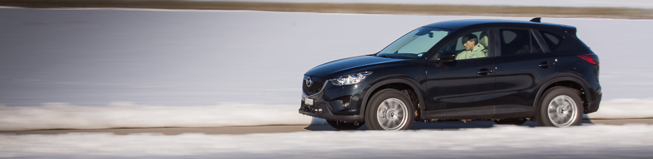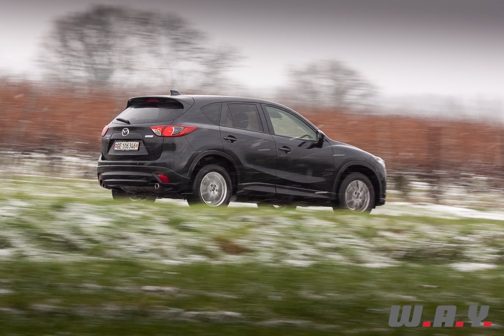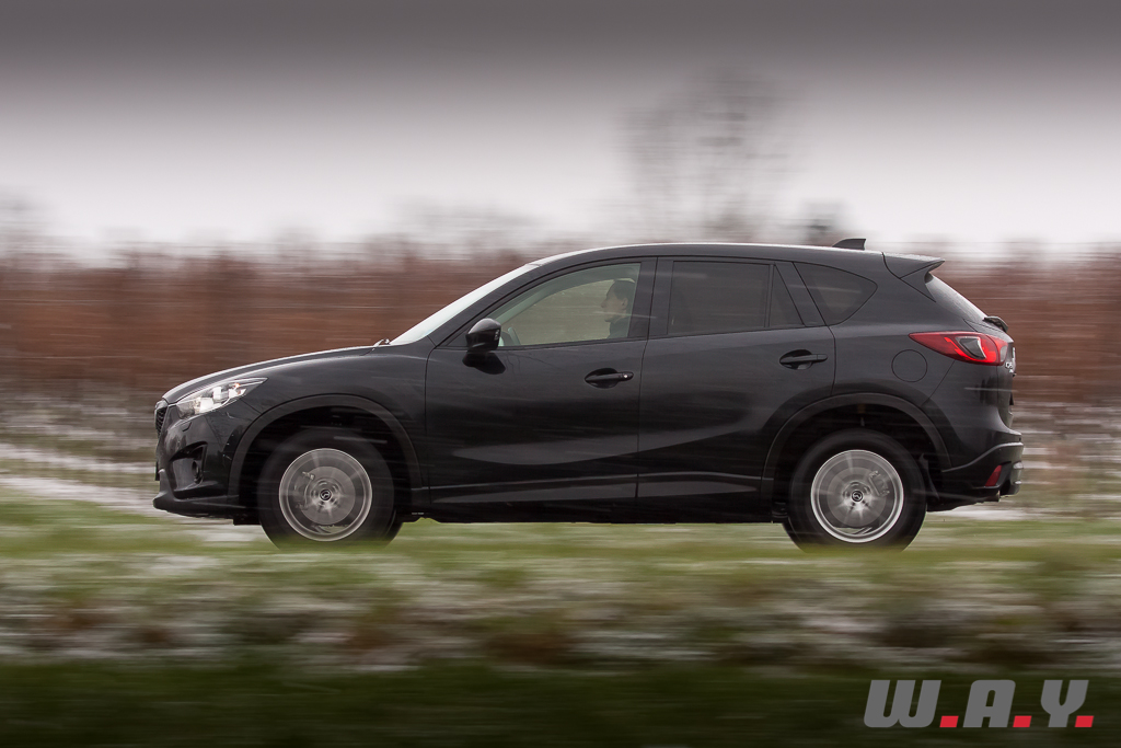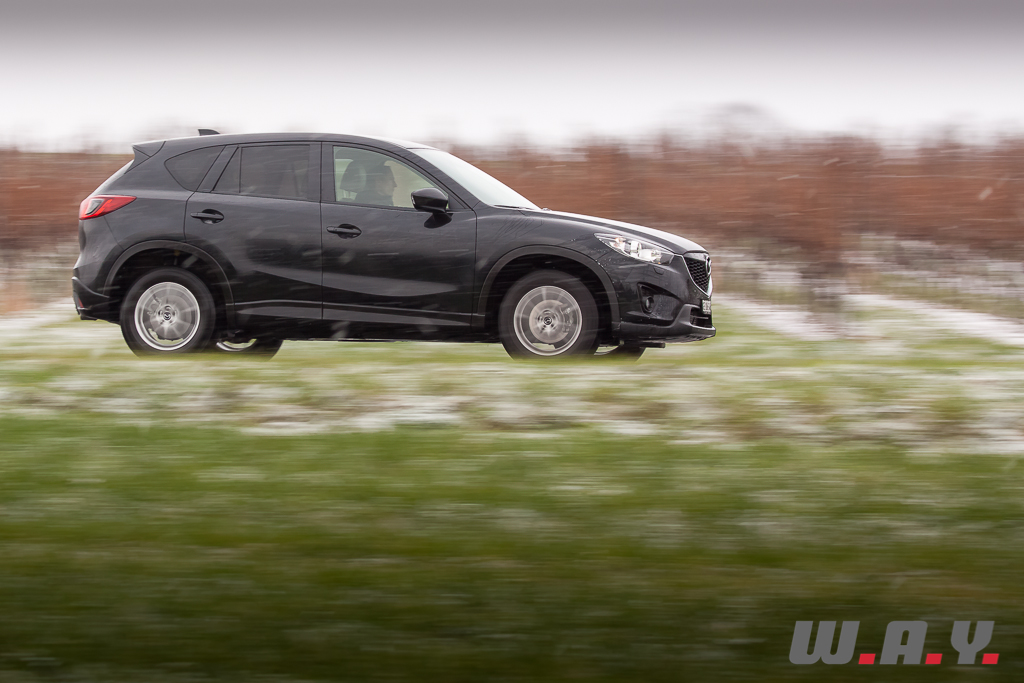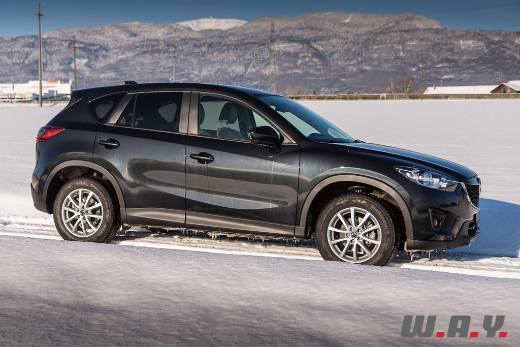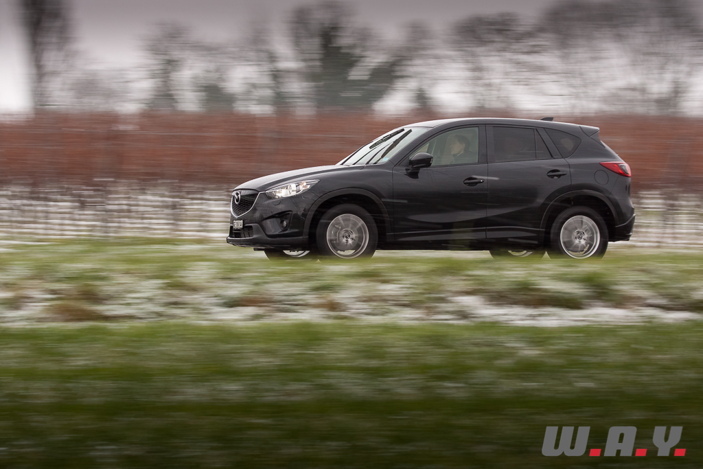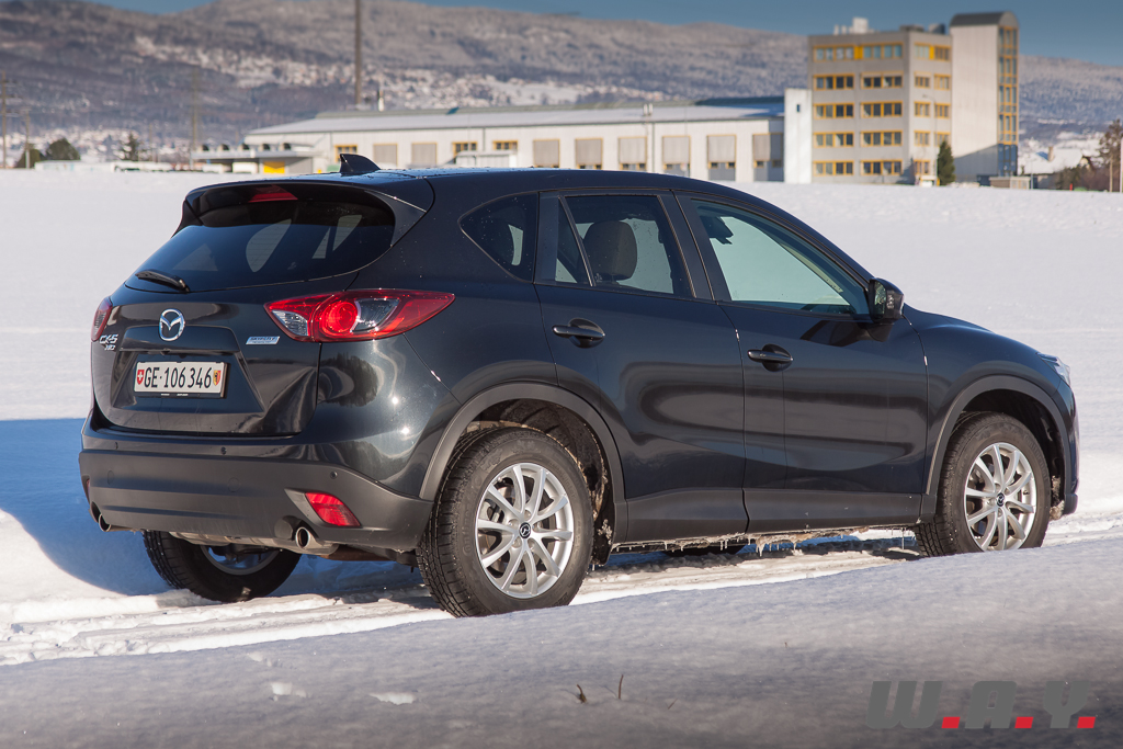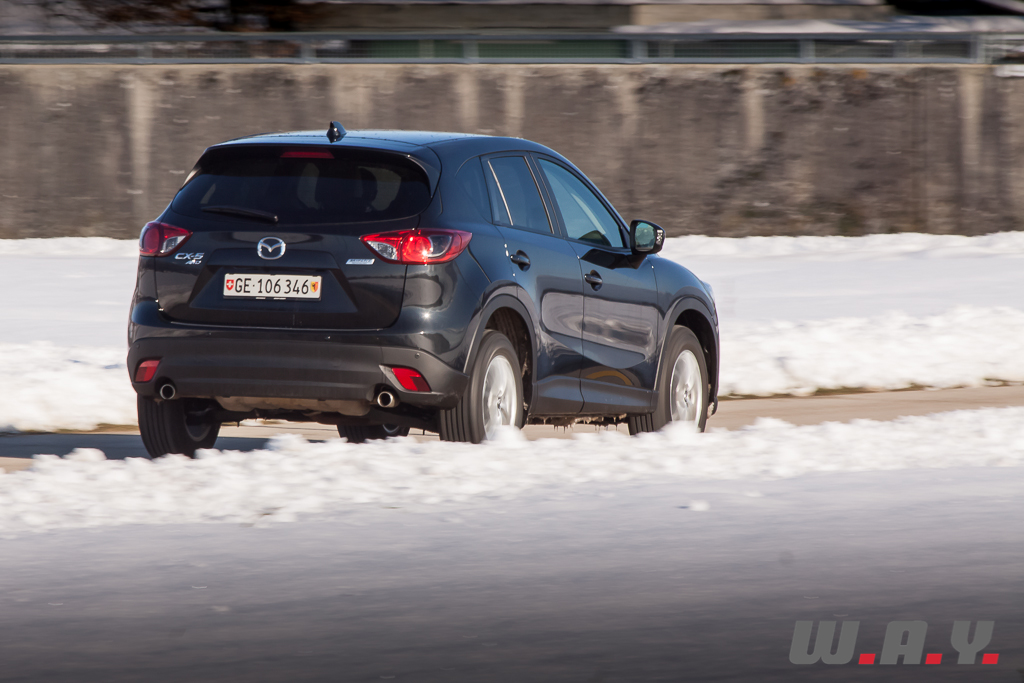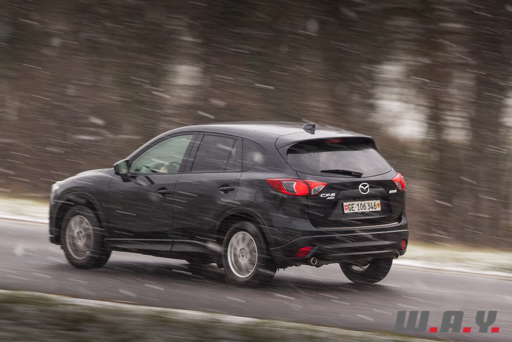 6h du matin, je regagne le CX-5. Il a passé la nuit dehors par -5° car l’accès au garage était impossible le soir dernier. Sur le toit, vingt bons centimètres de poudreuse le transfigurent et lui donnent encore plus d’importance. Tout en le dégageant, je le démarre de la première pression sur « start ». Pas le moindre signe de faiblesse. Vitres rapidement dégelées grâce à une ventilation efficace, je suis « d’attaque ». Il y a une bonne couche de neige. Le chemin ne laisse même plus apparaître mes traces de la veille. Une remarque au passage, j’ai déneigé dans une odeur de diesel peu agréable. Le moteur est bien équipé d’un filtre à particules mais pas d’un à mauvaises odeurs ! N’est-ce pas tous les diesels, qui lorsque la température est en dessous de zéro dégagent une mauvaise odeur ? Je ne me rappelle pas avoir autant été gêné avec le Q5 TDI ou encore le Cayenne diesel. En tout cas, ce sera bien là le seul reproche que je pourrais lui faire car la descente s’effectua en seconde, à basse vitesse, dans un confort et une sécurité royaux. Arrivé en bas du chemin, juste avant de reprendre la route, j’ai remis mon gros coup de gaz laissant venir d’un coup d’un seul les 420 Nm. Comme je m’en doutais, l’arrière se déporta m’obligeant à contre-braquer légèrement pour rester en ligne. En levant le pied la voiture reprit de suite sa trajectoire sans aucun souci. Un comportement presque joueur, tout en restant prévenant sur un crossover de cette longueur, je ne m’y attendais pas. Une bonne surprise pour moi car il n’y a pas moyen d’y voir une voiture dangereuse, il suffit de doser intelligemment. De toute façon, l’électronique veille. Le CX-5 dispose d’un contrôle variable du couple sur les roues arrière avec une détection ultra-précise du glissement (répartition du couple jusqu’à 50/50 entre les trains avant et arrière). Il faut juste lui laisser un peu de temps dans certaines situations. Attention donc aux excès de couple mais je me répète, et très sincèrement, il faut le provoquer et que les conditions soient très glissantes pour qu’il survire. Prudence malgré tout en descente sur du verglas car comme avec tout SUV, c’est luge assurée. J’ai pu tester dans une pente dégagée sur route verglacée et là, même avec un poids contenu, j’ai glissé sans ne rien pouvoir faire qu’attendre de reprendre de l’adhérence.