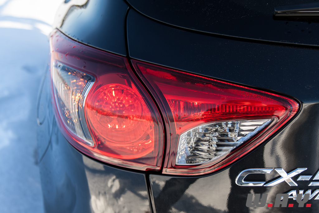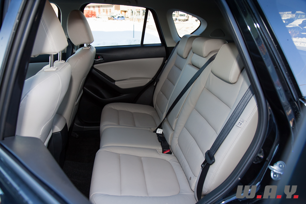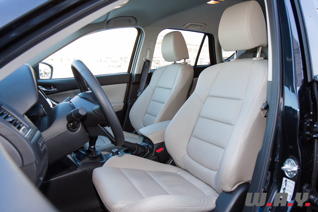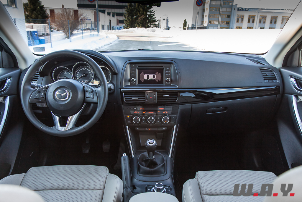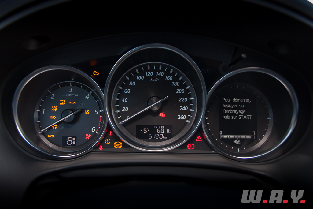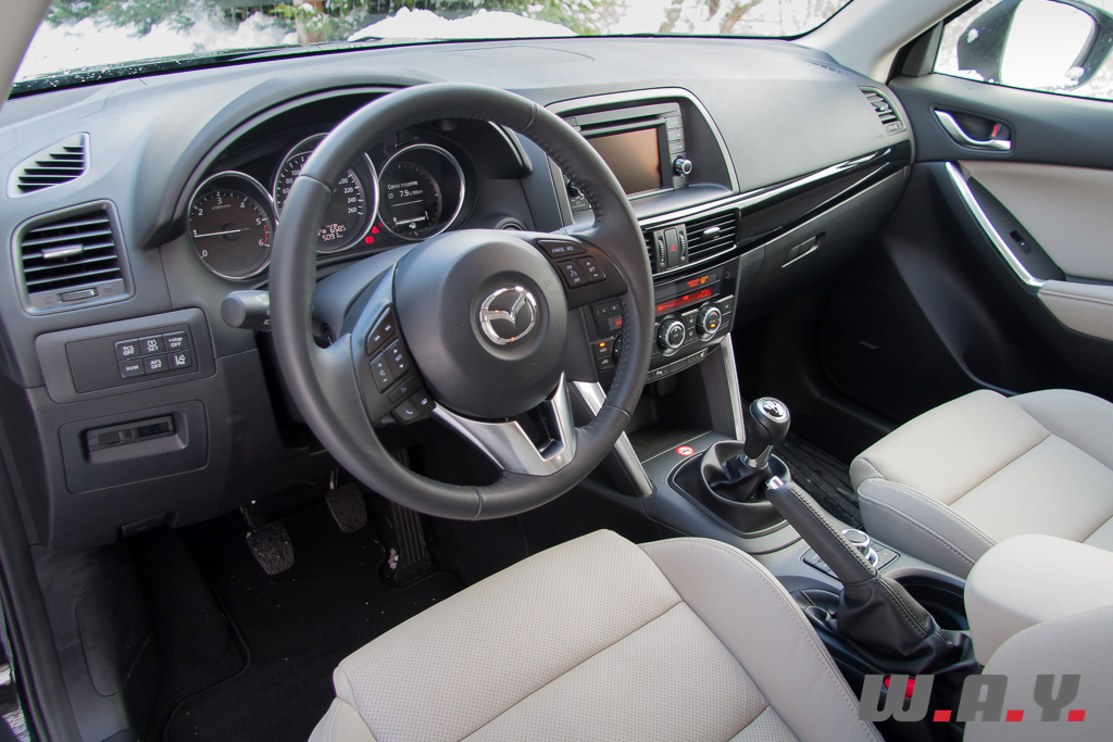 On monte dans un CX-5 et on se retrouve dans une ambiance, qui, sans être purement luxueuse, reste très valorisante. Sensation renforcée sur notre modèle d’essai par une sellerie cuir de grande qualité dotant le niveau de finition « Revolution ». Les revêtements moussés recouvrent garnitures de portes et planche de bord et contrastent avec des poignées et un volant réalisés en chromé satiné d’un effet qui respire la solidité et la sportivité. Même en tenant au cuir, les ingénieurs ont réussi à alléger les sièges tout en faisant en sorte qu’ils restent confortables. Celui du conducteur possède des réglages électriques dans huit directions. Globalement, l’intérieur est spacieux et le poste de conduite bien étudié.