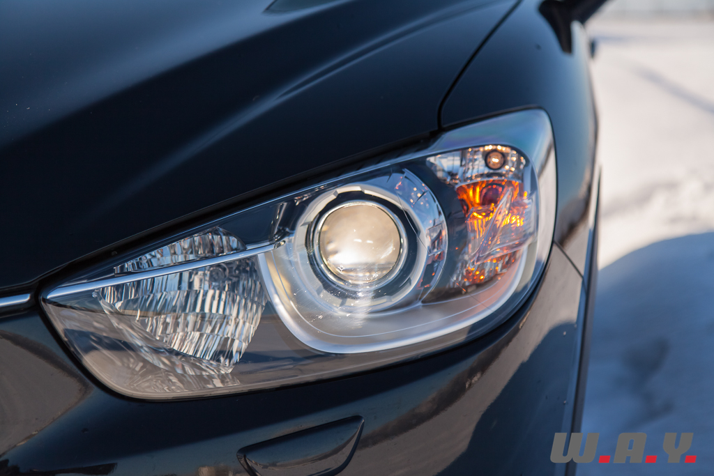 « KODO ou l’Ame du mouvement », telle est la nouvelle philosophie de design Mazda. L’ensemble est fluide et élancé donnant un dynamisme à ce SUV, l’un des plus grands de la catégorie en termes de gabarit (4m55 de long pour 1m84 de large). La face avant intègre une calandre en forme d’ailes déployées. Serait-ce le signe presque subliminal d’un nouvel envol pour Mazda ? Avec certitude, ce sera celui, très caractéristique, des futures Mazda. Elle inspire la légèreté mais aussi la robustesse. Les phares partent de la calandre pour s’étirer vers le galbe de l’aile. Les antibrouillards sont logés dans une petite ouïe qui reprend les lignes douces mais tendues de cette proue.