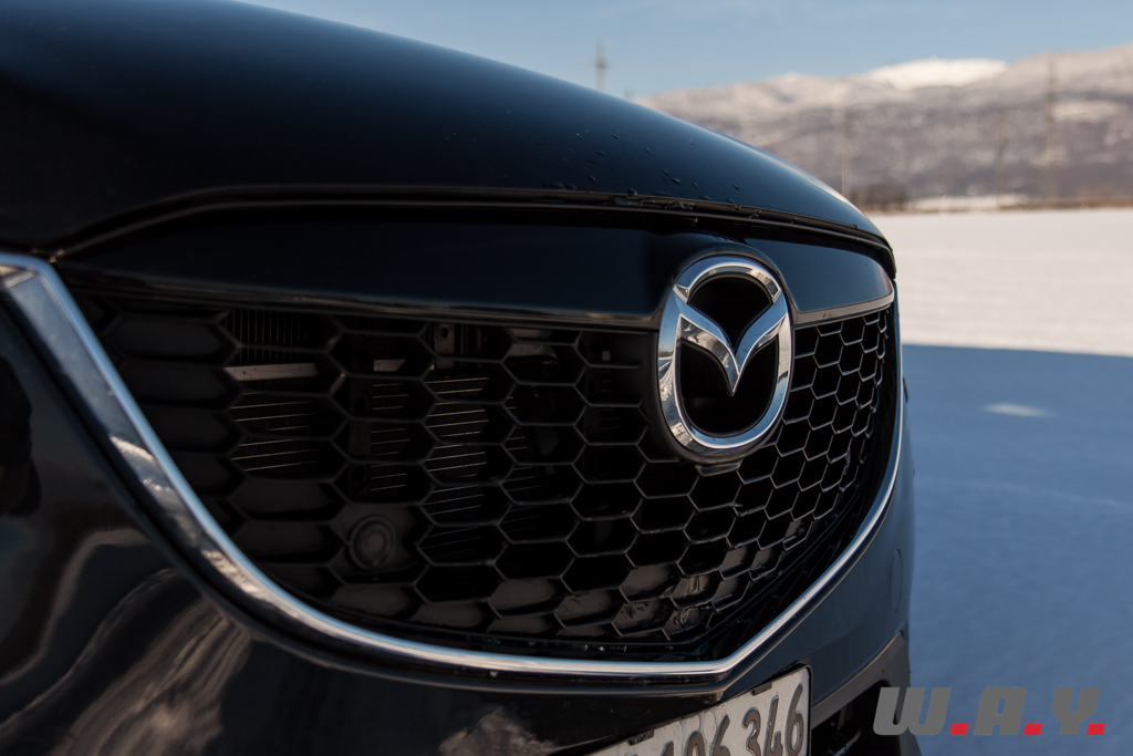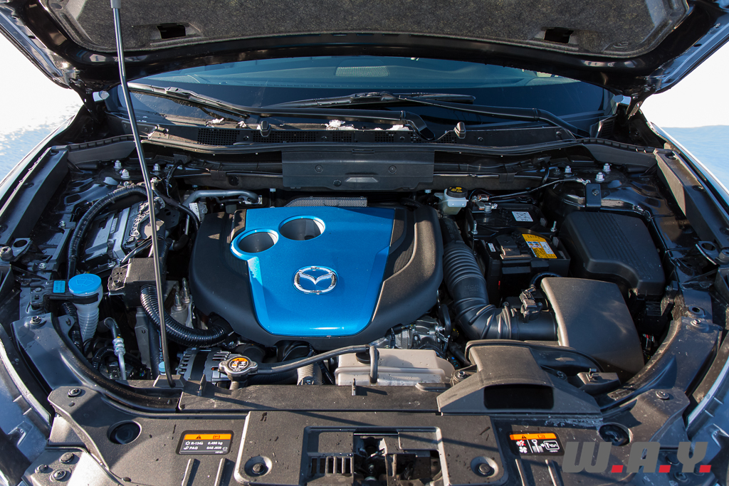 On découvre ici, sous un cache tubulure d’admission peint en bleu, l’un des deux nouveaux moteurs diesel de l’aire « Skyactiv ». Le 2.2 litres (2191 cm3) à haut rendement de 175 CV (à 4’500 tr/min), au couple généreux de 420 Nm dès 2’000 tr/min. Associé automatiquement à la version quatre roues motrices, ce moteur se montre volontaire, puissant et surtout extrêmement coupleux. Issu d’une recherche poussée, il possède un taux de compression extraordinairement bas pour un diesel de 14:1. Niveau de compression, qui, par grand froid comme au moment de notre essai, aurait dû nous empêcher de démarrer, le gazoil refusant de s’enflammer. C’était sans compter sur la recherche issue du programme Skyactiv qui a résolu le problème, sans aucun additif. Comment ? Kiyoshi Fujiwara, Directeur exécutif chargé de la recherche et du développement ainsi que du programme Skyactiv ne nous le révélera pas, c’est bien logique ! Plus fort encore, ils ont gardé le même taux de compression pour le 2 litres essence (14:1), repoussant les limites du seuil du cliquetis, rare pour un quatre cylindres essence, plus haut encore que celui rencontré en F1 !