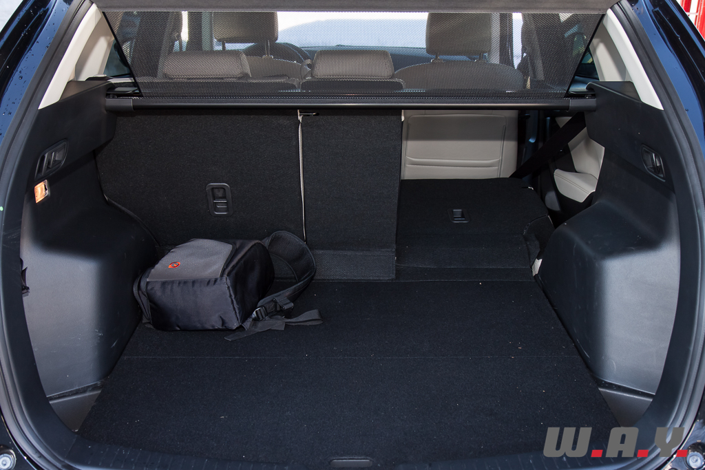 L’ingénieuse banquette arrière se rabat en trois parties – 40/20/40 – et cela d’une simple traction sur les leviers déportés disposés dans le coffre. On tire et hop ! l’assise s’escamote sous le dossier. C’est « l’effet Karakuri » du nom de l’inventeur du système. Pas bête non plus, le cache-bagages à enrouleur qui s’étire et se ferme en même temps que le hayon. Une ouverture pratique et immense donc sur un coffre qui l’est tout autant avec 503 litres qui incluent le logement intégré sous le plancher. Quasiment dépourvu de parties saillantes, il permet un chargement parfaitement plat et le volume peut être étendu à 1 620 litres sièges arrière rabattus.