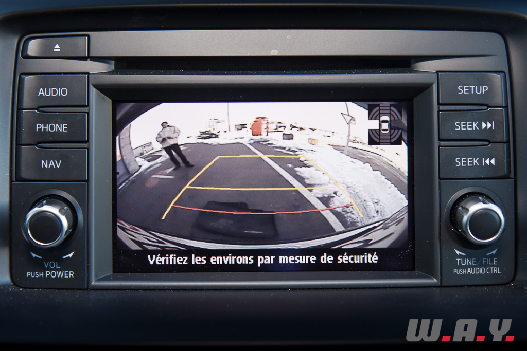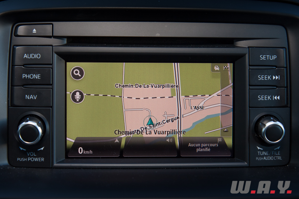Malgré une recherche effrénée de solutions dans le but d’abaisser le poids général, il y a paradoxalement pléthore d’équipements. Surtout dans cette finition haut de gamme qui comporte une Interface HMI (commande les systèmes de navigation et d’info divertissement) intégrée à la console centrale et associée aux commandes au volant, toutes les connexions nécessaires au monde moderne (Bluetooth, USB compatible iPod avec affichage des informations musicales sur un écran tactile de 5,8’’), prise AUX standard et un système audio Bose 9 HP développé pour le CX-5 et qui complètent la panoplie.
